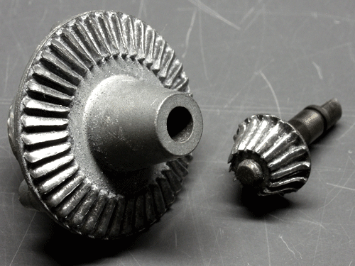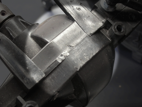 ワイドナーの無い状態でテスト走行しておりましたが、走りも良好、オイルダンパーのオイルやスプリング等のセッティングも無難な走りを可能としていました。 しかし!ここで問題が発生です!ギャラリーコーナー1番下にある青色ブロンコ(SW2+TLT)から流用アップグレードしたSW3TLTなのですが、数パック走らせた後、ついにホーシングが音をあげてしまいました。リア側のべベルギアの磨耗が原因でした。やはりこまめなメインテナンスやフロントに比べリア側への負担が大きいと痛感しました。