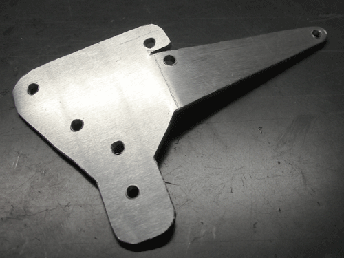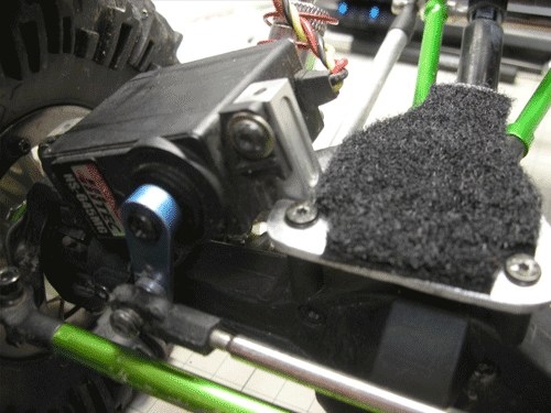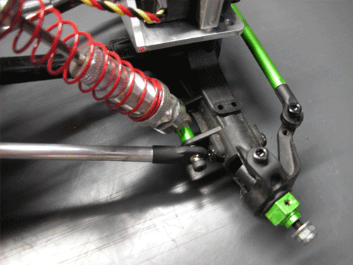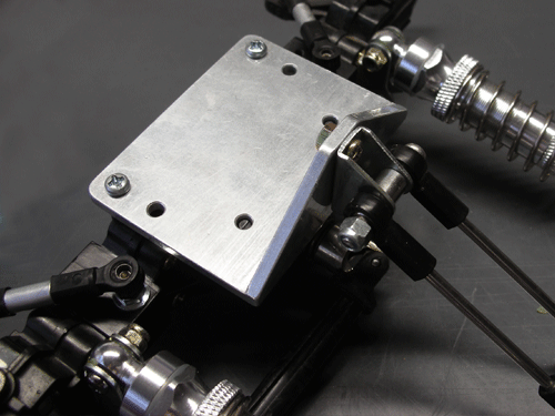 サーボを右前輪方面へオフセットさせ、トルクツイスト時に浮き上がりがちな右前輪に少しでも多く荷重がかかるよう、又サーボ自体を少しでも重心の低い位置に取り付けることを考え製作しました。また、タイヤの切れ角によりステアリングを切った状態でもサーボが当たらないような位置に調整し製作しました。実は、タイヤにサーボが当たらないように作ることが一番難しかったです・・・。
