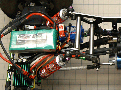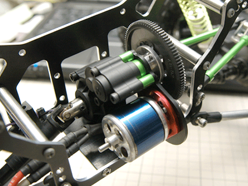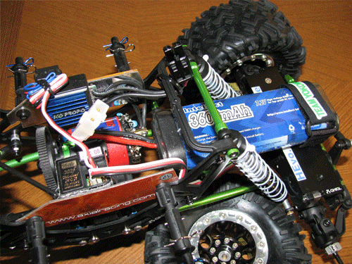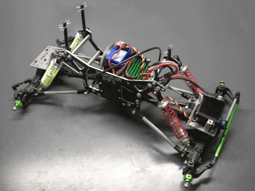 AX10ギアボックスを搭載したことにより、一段と走行性能が向上したということで、今回は、「重量物をシャーシに残さない」ということを前提にメカ類をフロントへ搭載することにしました。