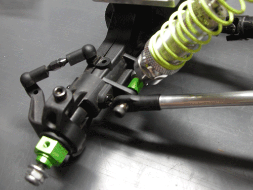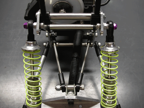 ・外径が大きい特徴を活かす為、オイルダンパー長を短めにセッティングし、シャーシ高は変わらないが重心がタイヤ中心部分に近づけて見た。